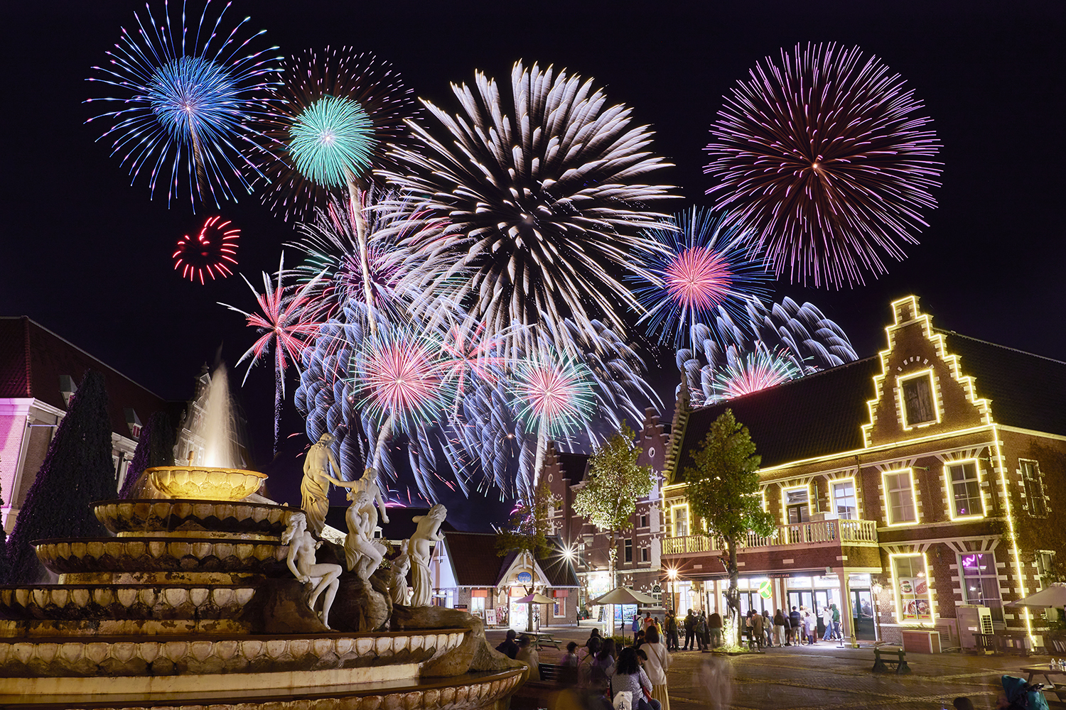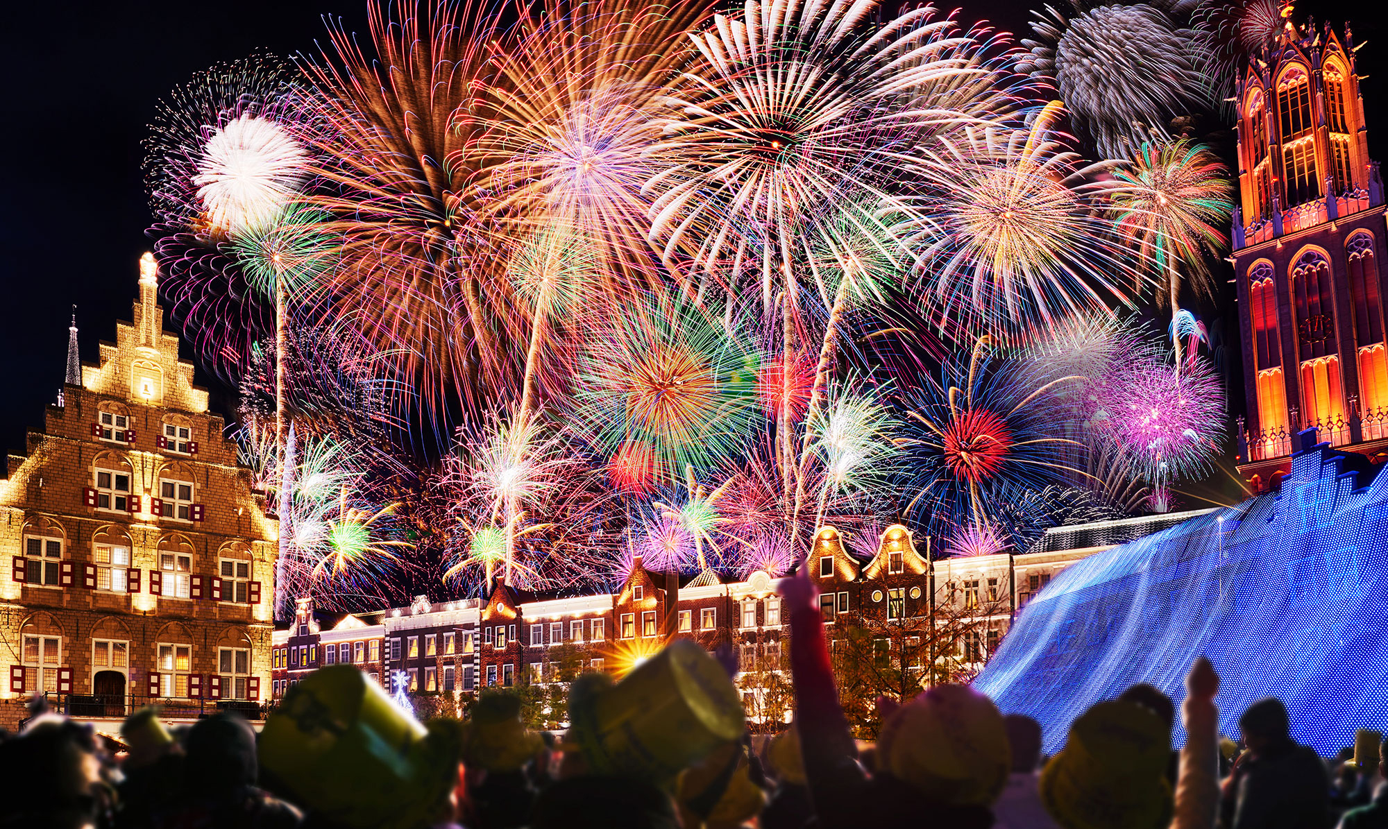 カウントダウン花火としては日本最大規模となる8,000発の花火が夜空を埋め尽くし、ハウステンボス全体が祝祭感に包まれます