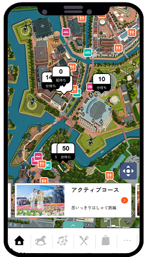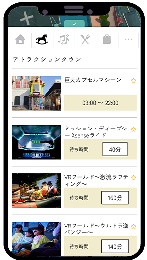 어트랙션 의 시간 이나 레스토랑의 대기조수가 맵상이나 일람으로 보실 수 있습니다.